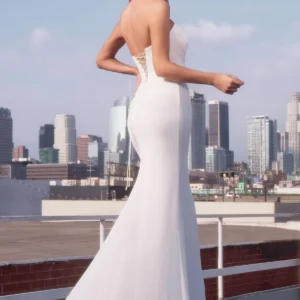 Este vestido ajustado sin tirantes está confeccionado en un ligero chiffon, con un escote redondo y un corpiño delicadamente fruncido que le da un aire suave y romántico. Su diseño estructurado con espalda tipo corset ajustable garantiza un ajuste seguro y favorecedor. Perfecto para una cena de ensayo, fiesta de compromiso o boda en destino, este vestido combina elegancia sin esfuerzo con un encanto atemporal.