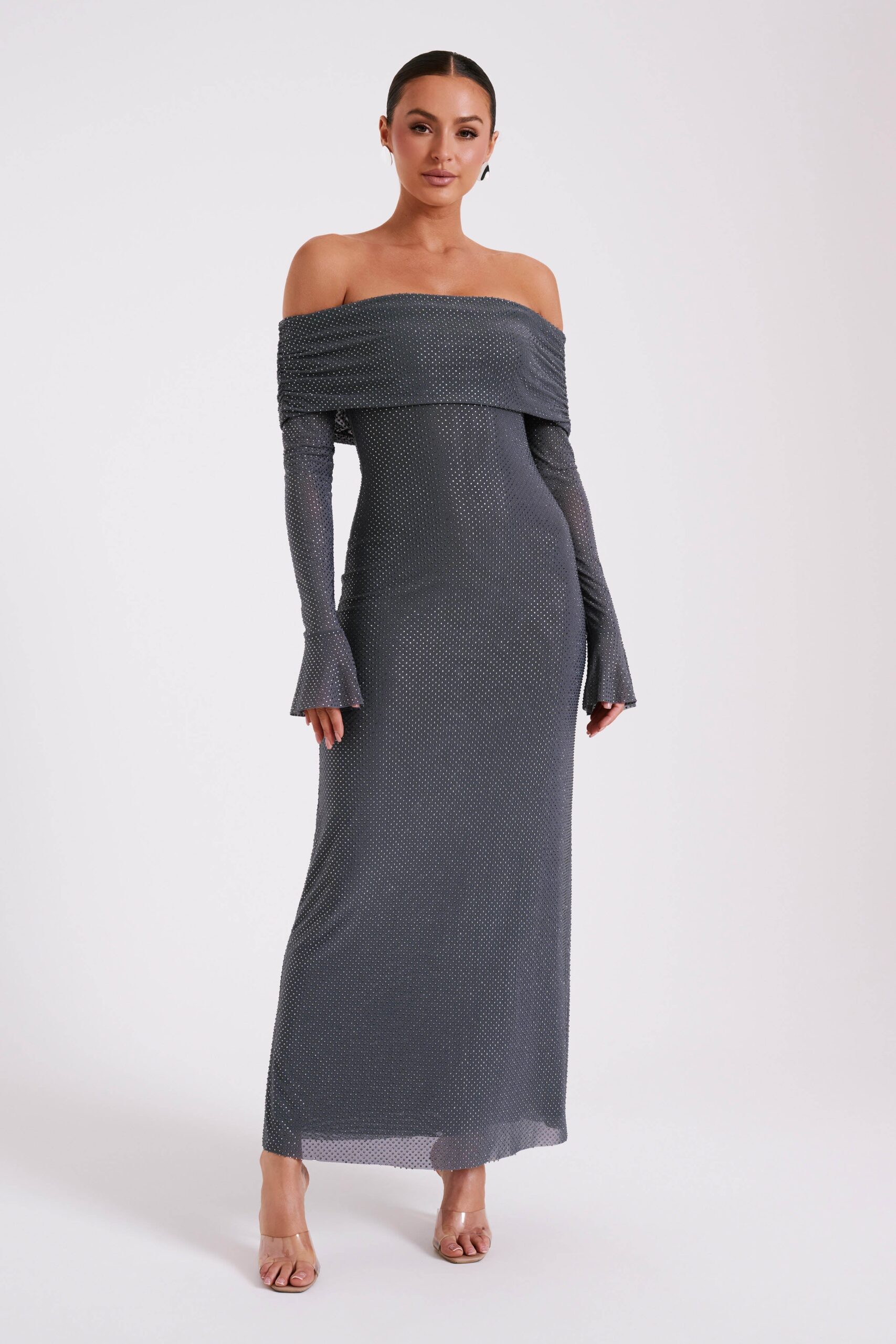 El MARCEL es un vestido maxi entallado con falda recta y mangas largas. El escote off-shoulder combina perfectamente con la capa de tela sobre el busto, mientras que las mangas largas han sido diseñadas para ajustarse a los brazos y luego abrirse en puños acampanados alrededor de la muñeca y la palma. Adornado con pedrería, el material elástico del MARCEL promete tanto comodidad como brillo.