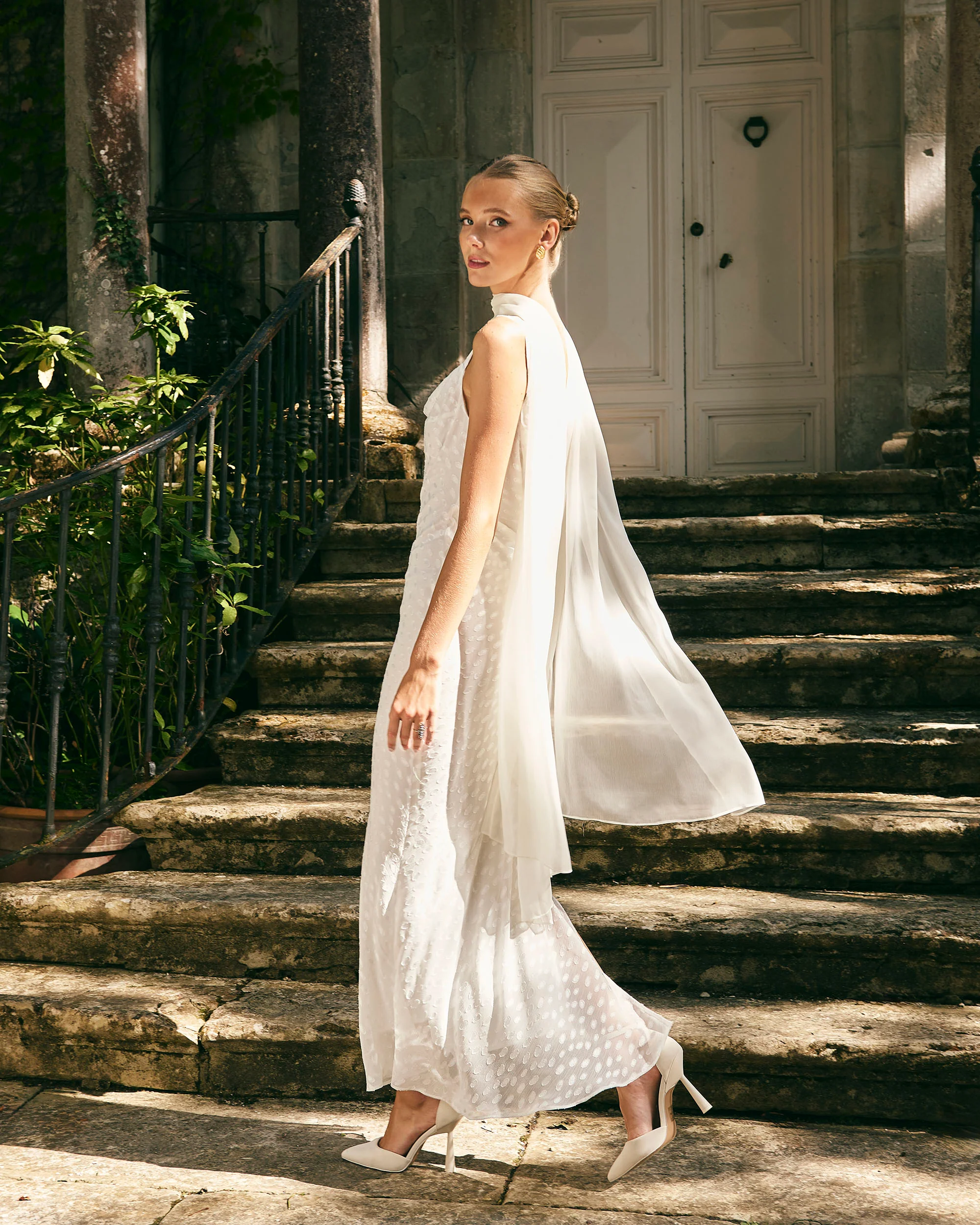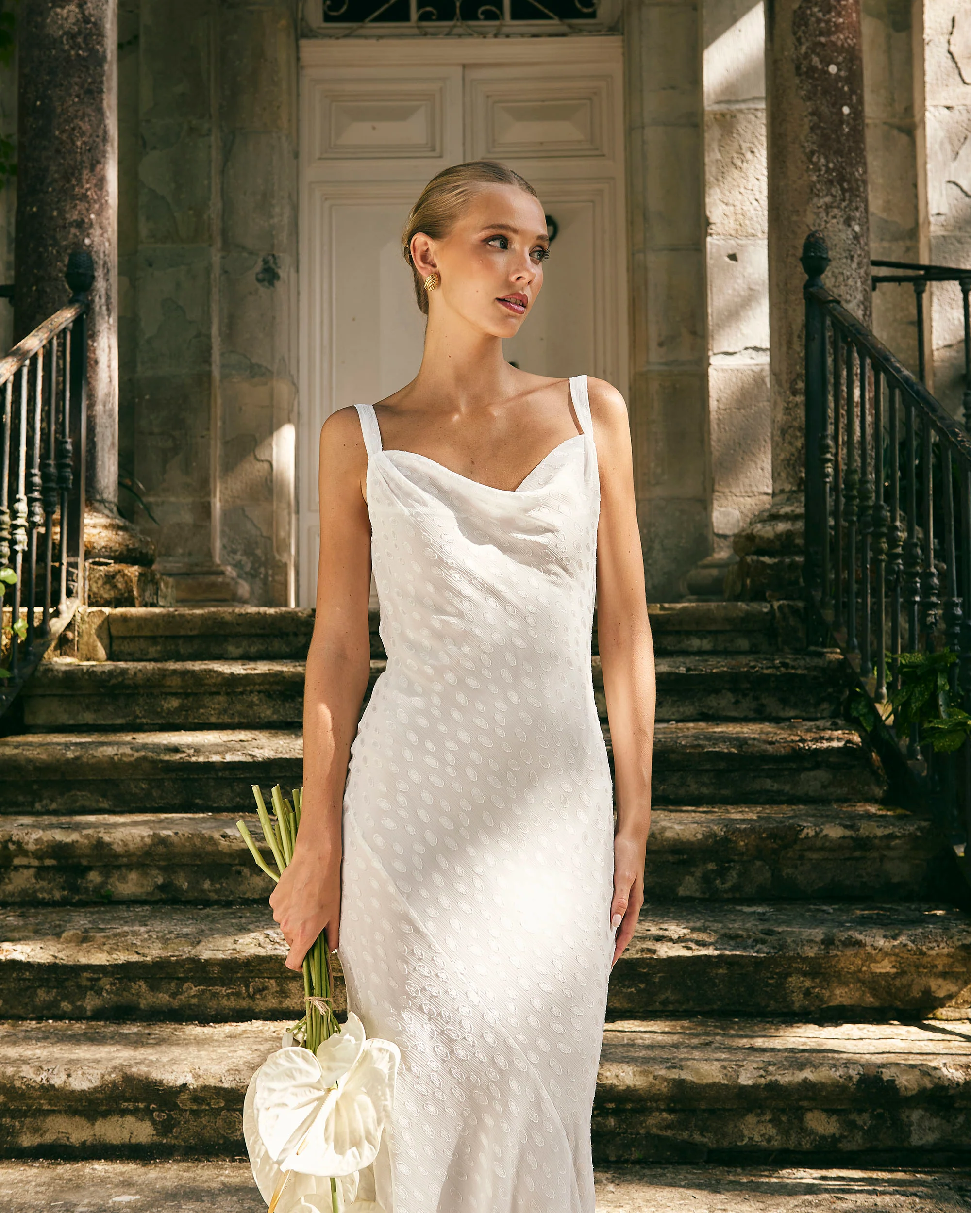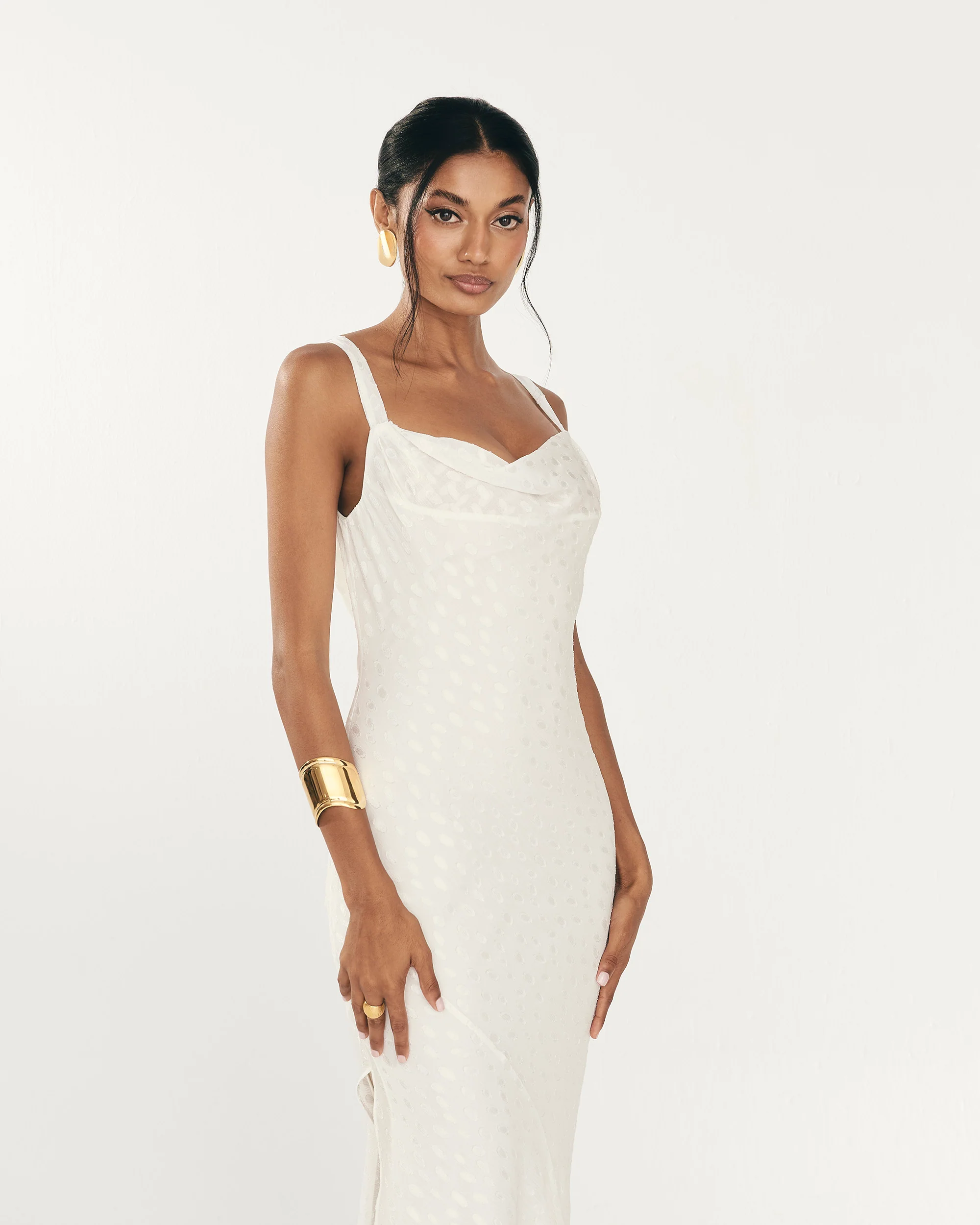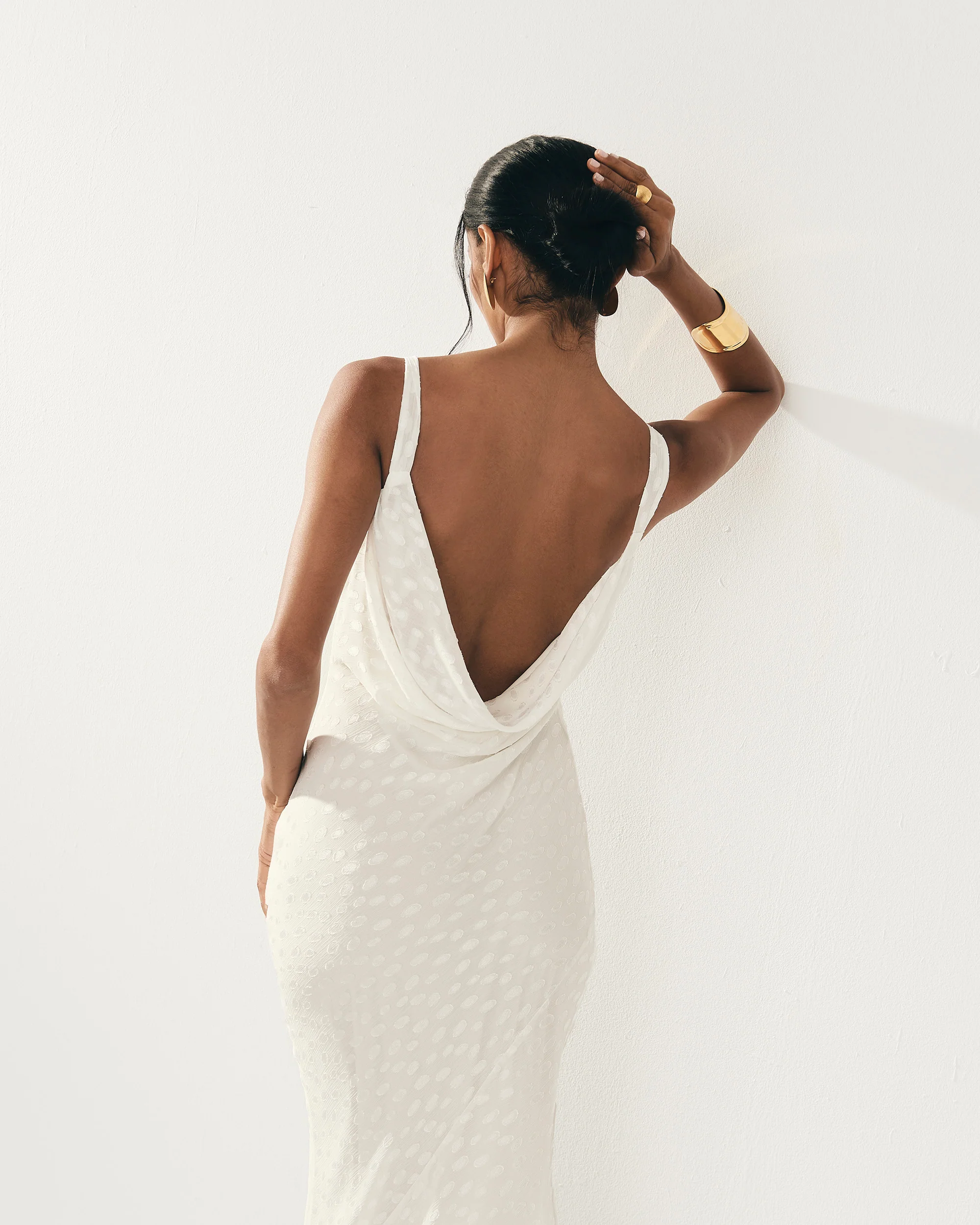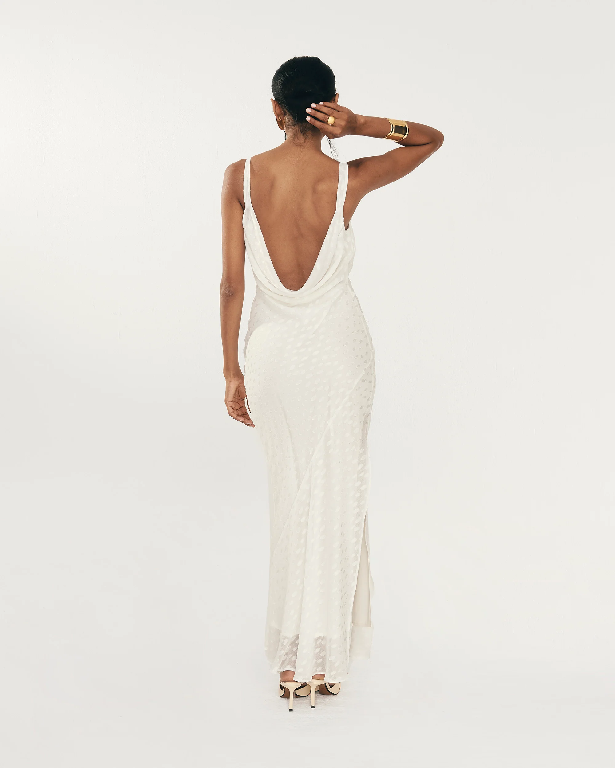 Vestido midi con escote drapeado en la espalda, abertura lateral y corte asimétrico en la falda para darle movimiento.