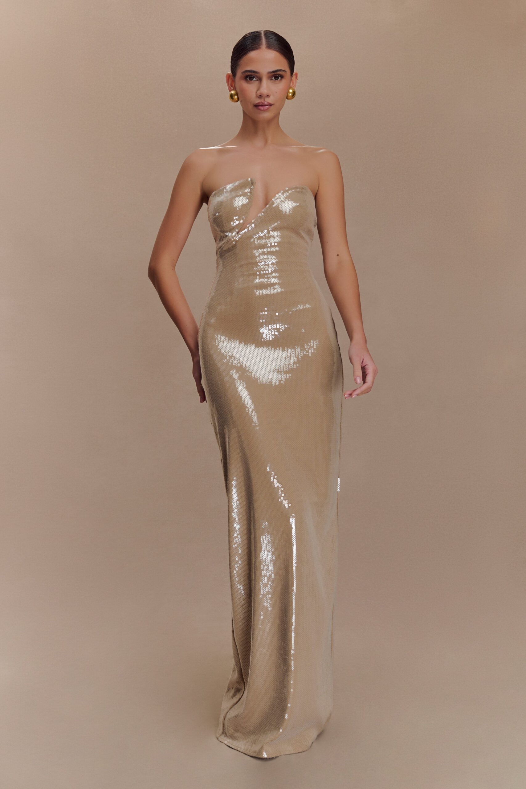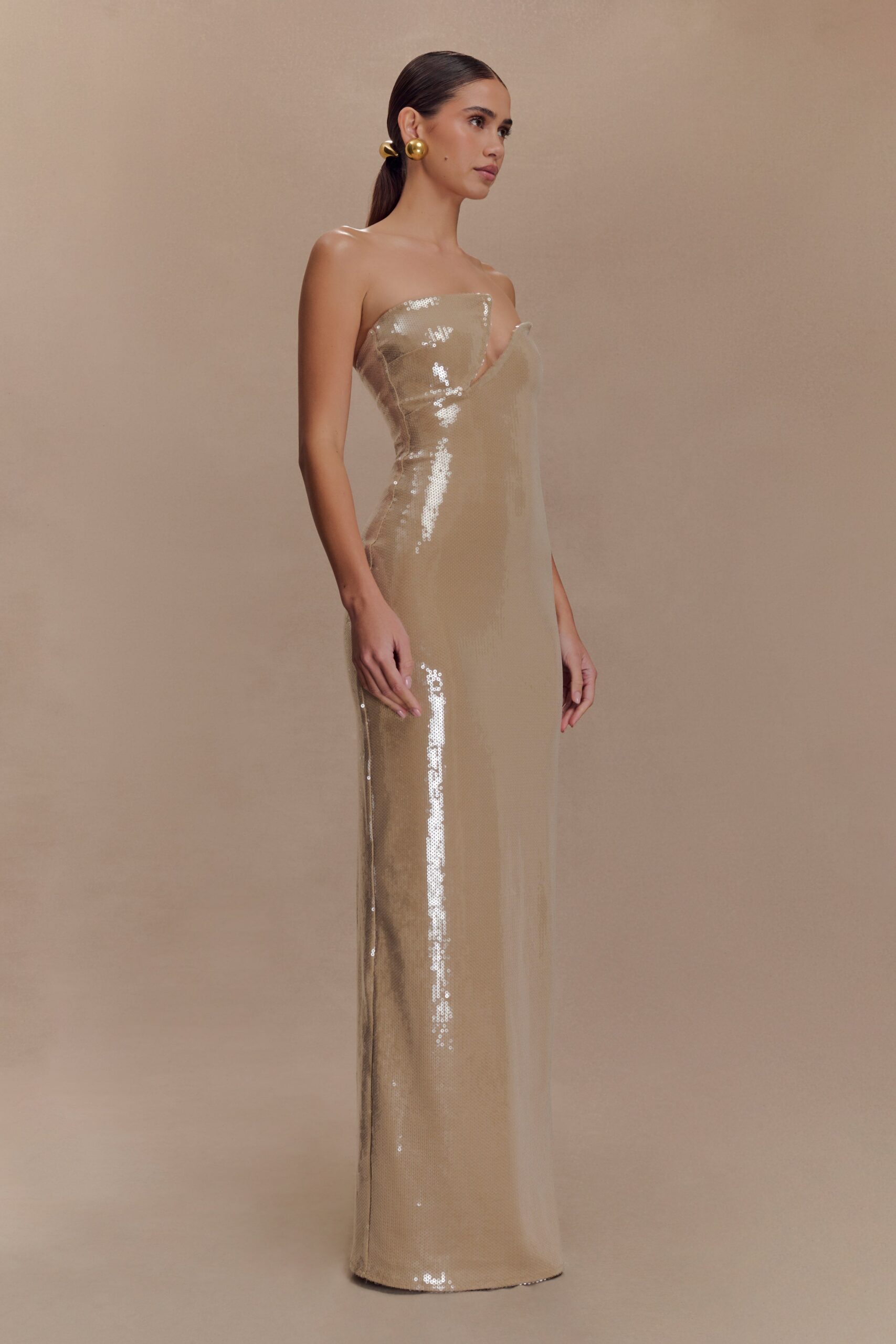 El vestido maxi strapless de lentejuelas WINSTON es el showstopper definitivo. Confeccionado en un espectacular tejido de lentejuela metálica en tono plateado, este vestido protagonista presenta un escote asimétrico y estructurado que resalta el escote con una elegancia moderna. Su silueta entallada sin tirantes realza las curvas y cae hasta un largo maxi estilizado, mientras que la espalda recta abierta y el cierre invisible mantienen un acabado limpio y sofisticado. Perfecto para eventos nocturnos donde solo el brillo es suficiente.
